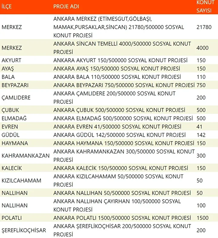 Ankara’da 30 bin 823 konut, Etimesgut, Gölbaşı, Mamak, Pursaklar, Sincan, Akyurt, Ayaş, Bala, Beypazarı, Çamlıdere, Kızılcahamam, Çubuk, Elmadağ, Evren, Güdül, Haymana, Kalecik, Kahramankazan, Nallıhan, Polatlı ve Şereflikoçhisar olmak üzere 21 ilçede yapılacak.